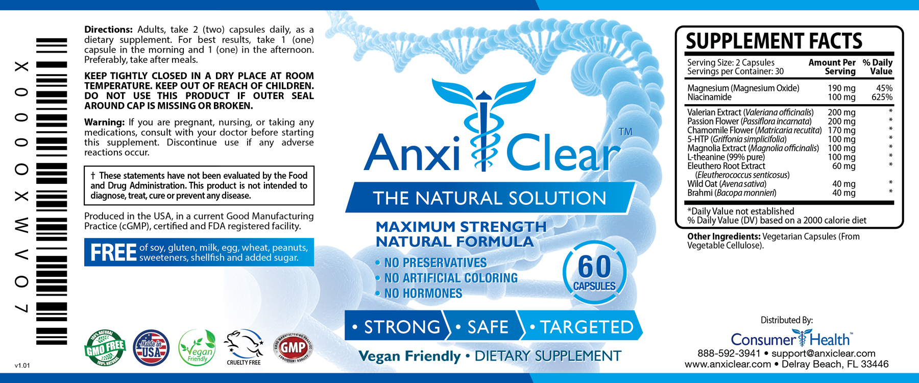 AnxiClear™ contains clinically tested ingredients that meet the strength and purity guidelines of the USP/NF (United States Pharmacopeia–National Formulary) . AnxiClear™ is manufactured in the United States in an FDA registered laboratory that exceeds industry standards. Our manufacturing facility is GMP-certified and abides by the strictest FDA recommendations.