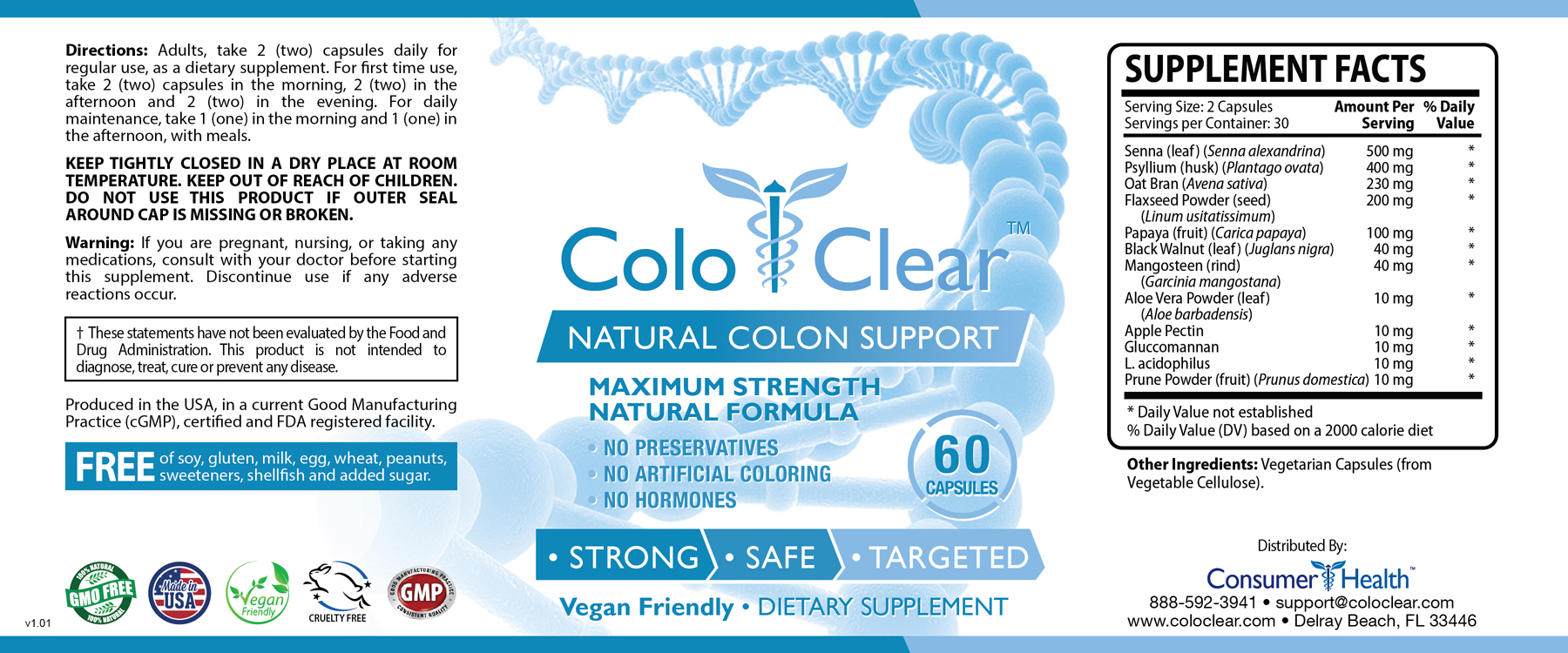 ColoClear™contains 12 tested ingredients that meet the strength and purity guidelines of the USP/NF (United States Pharmacopeia National Formulary). It is manufactured in the United States in an FDA registered laboratory that exceeds industry standards. Our manufacturing facility is GMP-certified and abides by the strictest FDA recommendations.