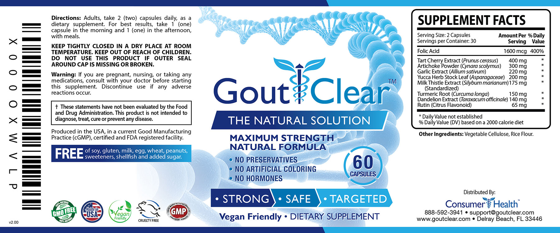GoutClear™ provides a maximum strength solution, attacking the core of the problem from multiple angles. When a capsule is taken, the powerful ingredients travel through your blood to support optimal uric acid levels, without any unwanted side effects. The nutrients are active throughout the day, giving you comfort on the go. Why deal with ineffective products and old-fashioned nostrums, when GoutClear™'s ingredients have provided comfort to so many?