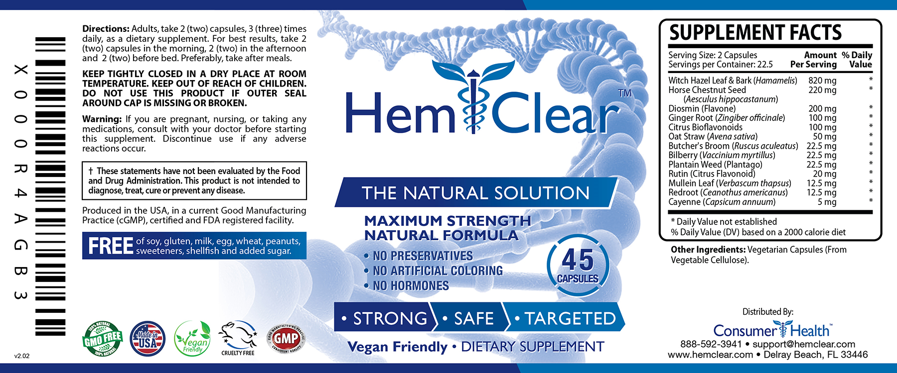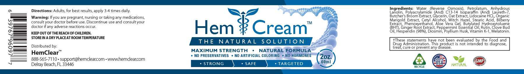 HemClear's™ recommended use for adults is to take 2 (two) capsules), 3 (three) times daily with each meal. Take 2 (two) capsules in the morning, 2 (two) in the afternoon and 2 (two) before bedtime. HemCream™, for best results, needs to be applied 3-4 times daily.