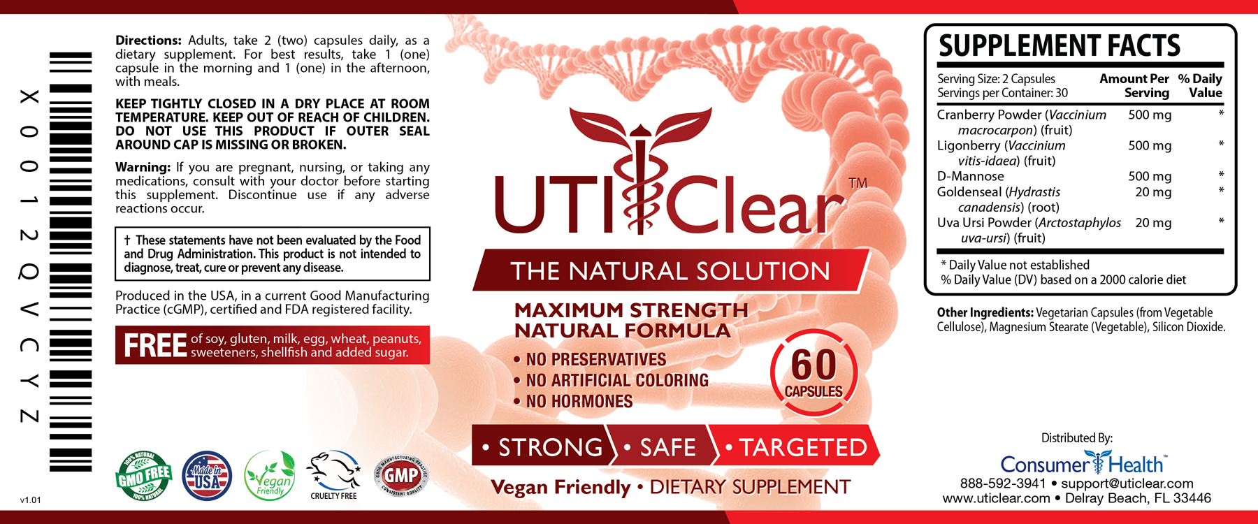 UTI Clear™contains 5 tested ingredients that meet the strength and purity guidelines of the USP/NF (United States Pharmacopeia National Formulary). It is manufactured in the United States in an FDA registered laboratory that exceeds industry standards. Our manufacturing facility is GMP-certified and abides by the strictest FDA recommendations.