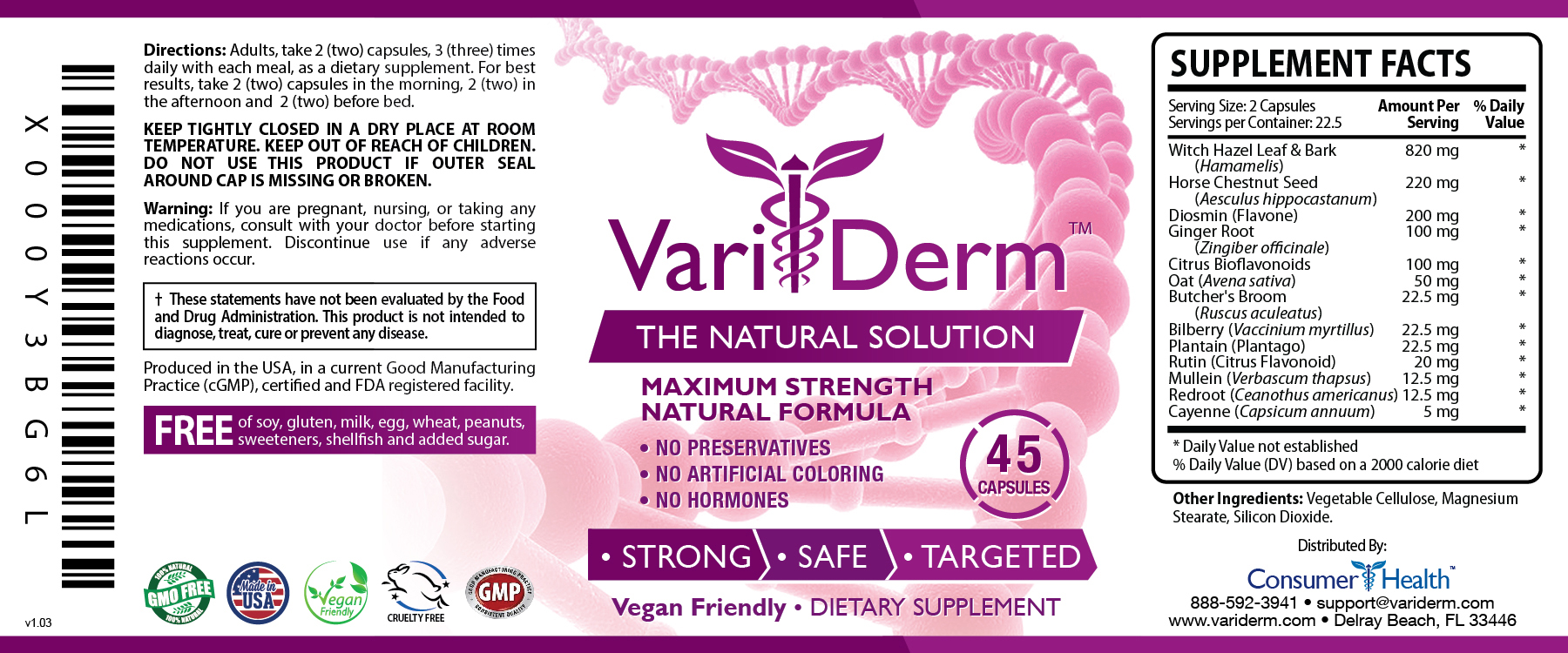 VariDerm™ and VariCream™is a double response proprietary solution, attacking the problem from multiple angles. When a capsule is taken, the powerful ingredients travel throughout your bloodstream working on the problem internally. VariDerm™ supports healthy vein tissue formation and function while helping to increase the blood flow inside your veins. VariDerm™ is fast and effective implementing only the safest all natural ingredients with no known side effects.